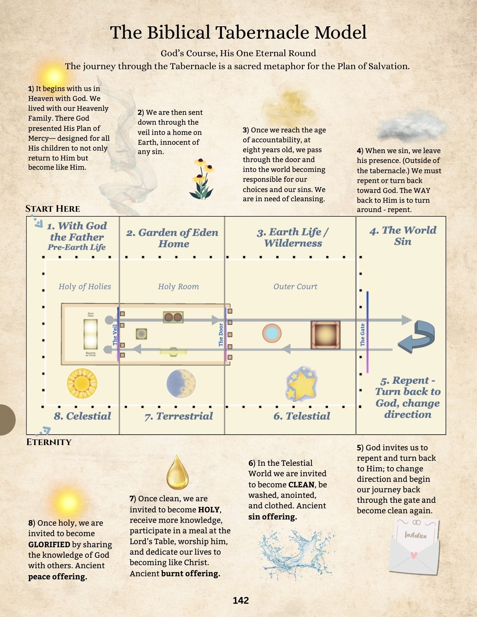 A page taken from the Path of Stone Tables, vol. 1, The Biblical Tabernacle Model God's Course, His One Eternal Round, is a captivating one-page guide that unveils the ancient Tabernacle as a profound metaphor for the Plan of Salvation. Starting in pre-earth life with God the Father, where His merciful plan is revealed, it traces our descent through the veil into earthly innocence in the Garden of Eden, then into the wilderness of accountability and sin that pulls us away from His presence. Through repentance—turning back toward God—we're invited to progress: becoming clean in the Telestial realm via washing, anointing, and clothing (echoing ancient sin offerings); holy in the Terrestrial through deeper knowledge, worship at the Lord's Table, and dedication demonstrated in the burnt offering; and glorified in the Celestial by sharing divine truths in the peace offering, culminating in eternal exaltation. Ideal for personal study, teaching, or family devotion, this illustrated model inspires repentance, growth, and Christlike living—download now and illuminate your path back to Him!